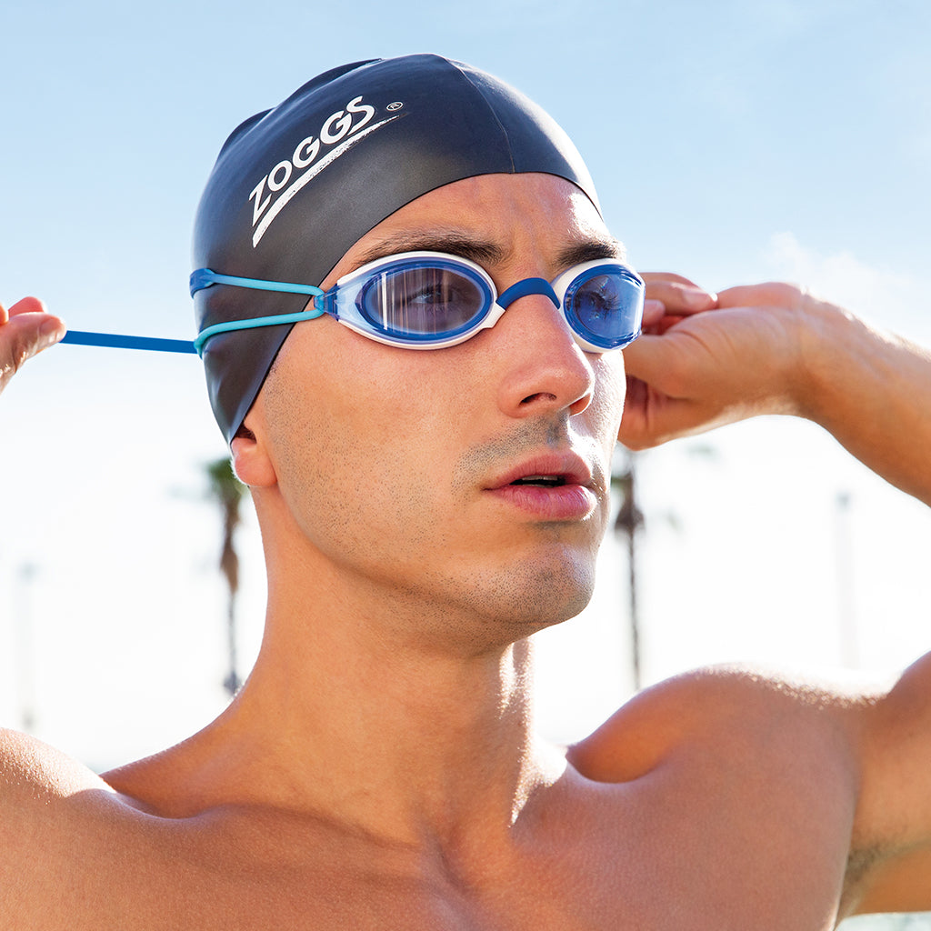 - Schwimmkappe drüberziehen: Setz zuerst die Brille auf und zieh dann die Kappe über das Band – das hält bombenfest, besonders beim Startsprung oder Tauchen.